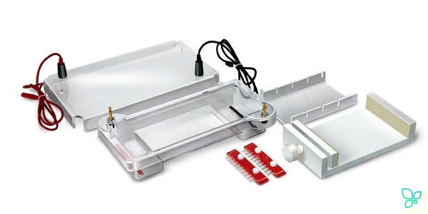 Размер геля 12,5×7,6 мм; ударопрочный литой корпус из прозрачного полистирола; УФ-прозрачная гелевая рамка, визуализация результатов анализа на трансиллюминаторе без снятия геля с подложки; заливочное устройство, с резьбовым зажимом, предотвращает утечку геля; рабочий объем буфера, мл размер геля, см — 250; рабочие условия, В / мА / Вт — 250 / 150 / <20; число рамок на гель — 1-4; число гребенок на гель – 1-4; число образцов — 10-40; гребенка 1 мм на 10 зубцов; габариты, ШхГхВ, мм — 265х145х95; вес, кг — 0,44.