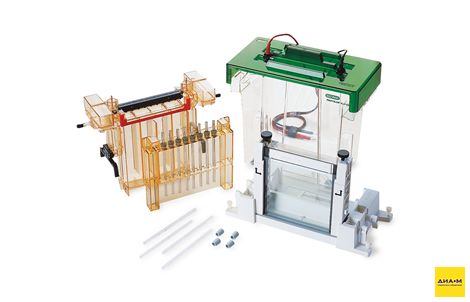 Комплект поставки: ячейка 2-D гель-электрофореза для трубок или гелевых пластин 1,5 мм, 20 см, стекла, заливочный столик, зажимы, 24 стеклянные трубки, 2 адаптора.