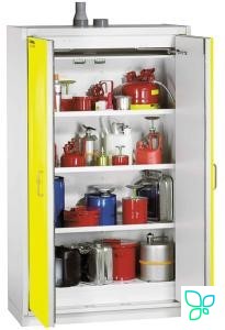 Комплект поставки: шкаф, полки (количество зависит от модели шкафа). Аксессуары: полки, нескользящее покрытие и полипропиленовые вставки для полок/поддонов, тележка для перевозки, «красный ящик» для безопасного хранения важных документов, запирающийся ящик, безопасные контейнеры и воронки для жидкостей, твердых веществ, контейнеры для проведения чистки и др.